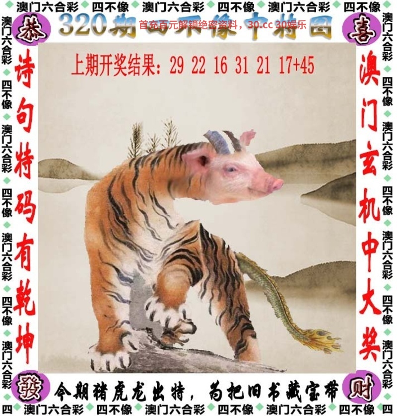 320期【今期猪虎龙出特,为把旧书藏宝带】虎28准 ①杀:狗马鼠 ②图解特肖:猪虎龙猴羊 ③合双+小数 本人取特都是有思路可寻,对错看天意,喷狗绕道 |